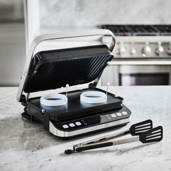 A perfect addition to any diet or lifestyle. The sleek, modern, and easy-to-use small kitchen appliance you need to cook up breakfast, lunch, or dinner. The versatile design and interchangeable plates allow you to press a panini or whip up hot and fresh waffles. Works as a contact grill, waffle maker, panini press, full grill, full griddle, half grill/half griddle with temperature ranges up to 450 degrees Fahrenheit. The easy-to-use intuitive digital LCD panel controls operate both the top and bottom separately. Heats extra fast, perfect when you’re in a hurry and have to make a quick breakfast. It’s perfect for preparing everyone’s favorites including waffles, sandwiches, hamburgers, hotdogs, chicken, and much more. Includes two silicone egg and spatula-style tongs. BPA-free. Reversible grill, griddle, and waffle plates are dishwasher safe. Measures 17”l x 9”w x 16 3/4”h. Plugs into any standard household outlet.